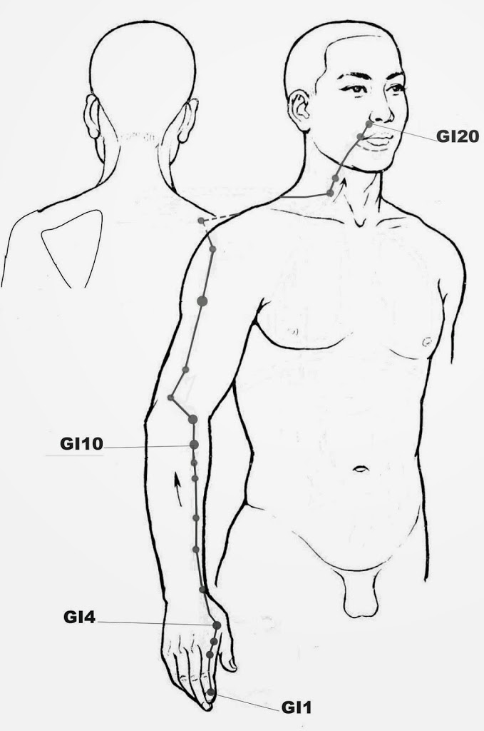 Le méridien du gros intestin correspond, pour sa part, à la partie Yang du méridien Yin des poumons. En effet, poumons et gros intestin sont liés. Ainsi il démarre au niveau de l’index (juste à côté du pouce) et remonte lui aussi jusqu’au visage. Il y a un point très intéressant sur ce méridien. Il s’agit du point n°4, que vous pouvez apercevoir sur le schéma ci-dessous. Il se situe sur le dessus de la main, à la croisée des lignes du pouce et de l’index. Pensez à masser très régulièrement ce point dès que vous avez un rhume, un problème de sinus, etc … Il est très efficace dans ces cas. C’est aussi un point de santé générale, que vous pouvez stimuler en toute occasion. Une seule contre indication : pour les femmes enceintes dans les 3 premiers mois de la grossesse, on évite de stimuler ce point.