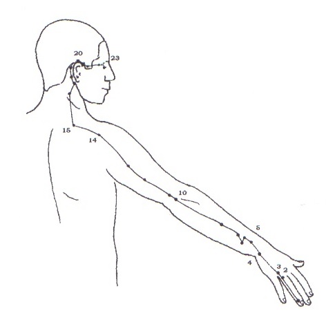 Et maintenant terminons par le méridien du triple réchauffeur. Celui-ci se situe au centre de la face extérieur du bras et correspond, en cela, à l’opposé du méridien Yin du péricarde. Il remonte également jusqu’au trapèze et contourne l’oreille. C’est pourquoi, nous massons cette partie du crâne (le contour des oreilles) car ainsi nous stimulons ce méridien et ce faisant, nous aidons à faire circuler l’énergie dans tous les organes (rappelez-vous le concept du triple réchauffeur que je vous ai décrit au début de l’article). Une astuce intéressante et qui fonctionne : imaginons que vous ayez besoin d’attention et de concentration pour quelques temps, massez votre crâne avec vos doigts de l’avant vers l’arrière en insistant sur le contour des oreilles, et vous verrez votre énergie et votre concentration s’accroître pour une heure ou deux. On ressent également cet effet en pratiquant le 1er mouvement des 8 Pièces de Brocart, qui correspond au réveil du triple réchauffeur.